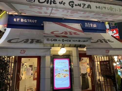 CAFE de GINZA MIYUKI-KAN 銀座2丁目店 http://www.cafe-ginza-miyukikan.com/shop.html 営業時間 平日9:00〜23:30 土日祝10:00〜23:30 ランチ 平日11:00〜14:00 モンブランが有名なスイーツ店に行った。夜遅くまでやっていることもあり人が常に出入りしてい…